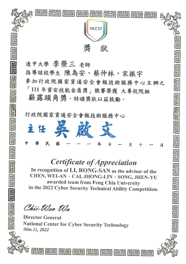 11 十一月 李榮三老師指導同學獲111年資安技能金盾獎-大專校院組嶄露頭角獎 系所亮點 1015 瀏覽 李榮三老師指導陳為安、宋振宇、蔡仲林參加行政院國家資通安全會報技術服務中心主辦之111年資技能能金盾獎競賽,榮獲大專校院組嶄露頭角獎。 分享連結 複製成功! 複製