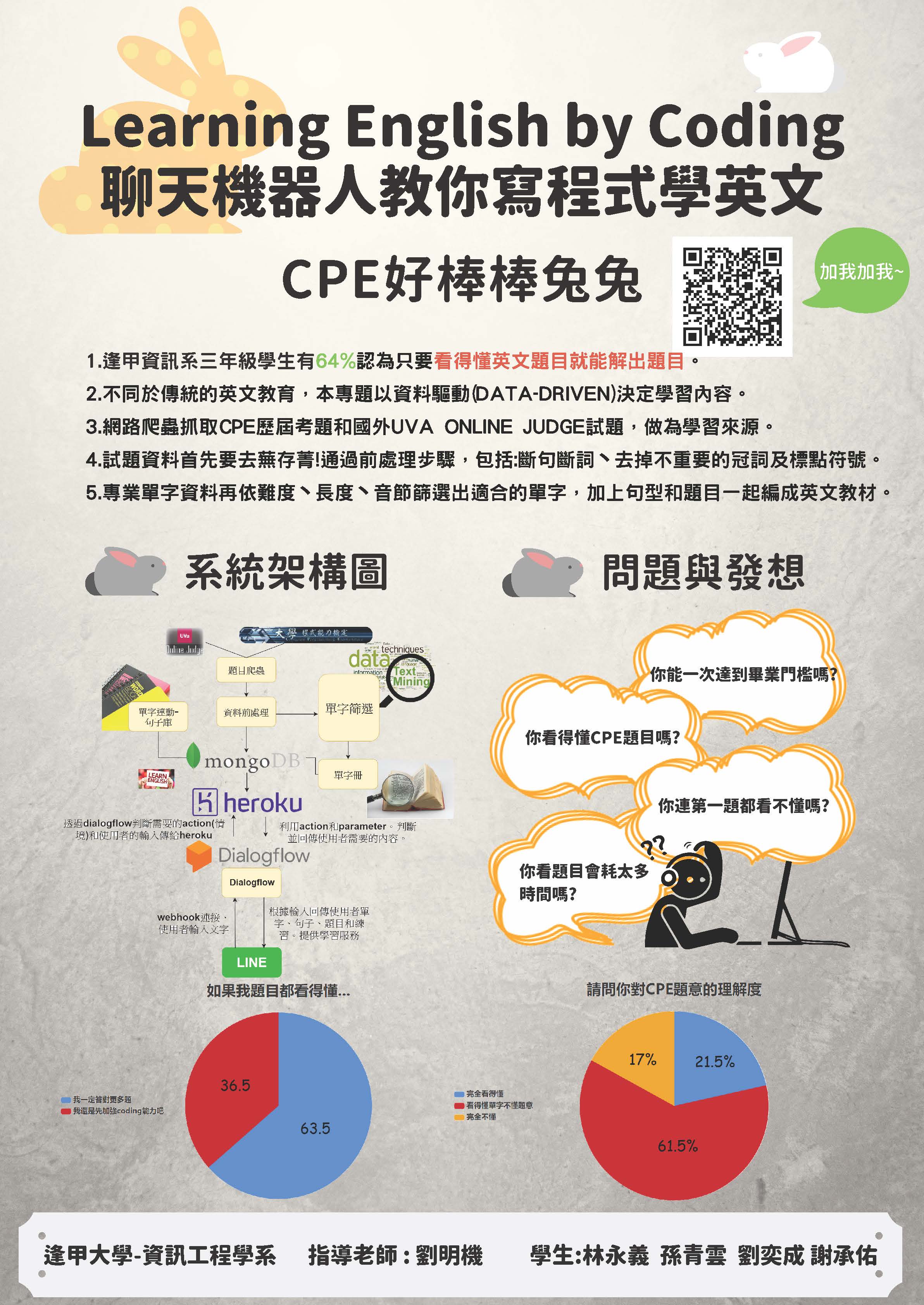 該系統從龐大程式題庫中,通過爬蟲、前處理、難度分析、編寫單字句子練習題等,製成一個教育資料庫,最後將教材由Line發送給使用者,使用者透過每天的練習提升英文閱讀能力,減少考試時讀題時間,便能更加投入程式邏輯的思考。