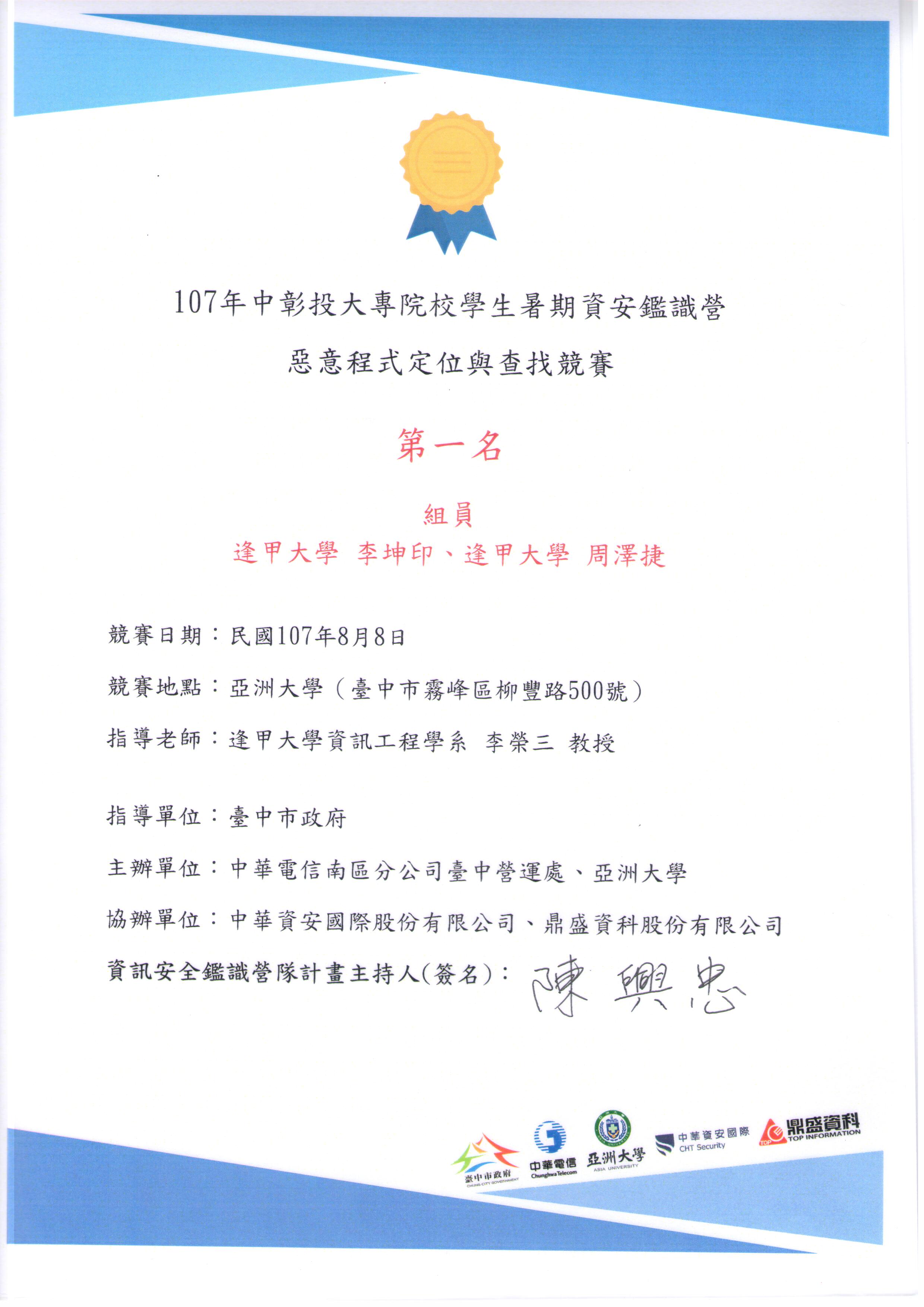 8 八月 賀!李榮三老師指導李坤印,周澤捷參加台中市政府委託中華電信舉辦之「惡意程式定位與查找競賽」榮獲第一名 系所亮點 2033 瀏覽 主辦單位 :中華電信南區分公司台中營運處、亞洲大學 得獎日期:2018年8月8日 指導教師 :李榮三 參賽同學 :李坤印、周澤捷 得獎最品名稱:惡意程式定位與查找競賽 分享連結 複製成功! 複製